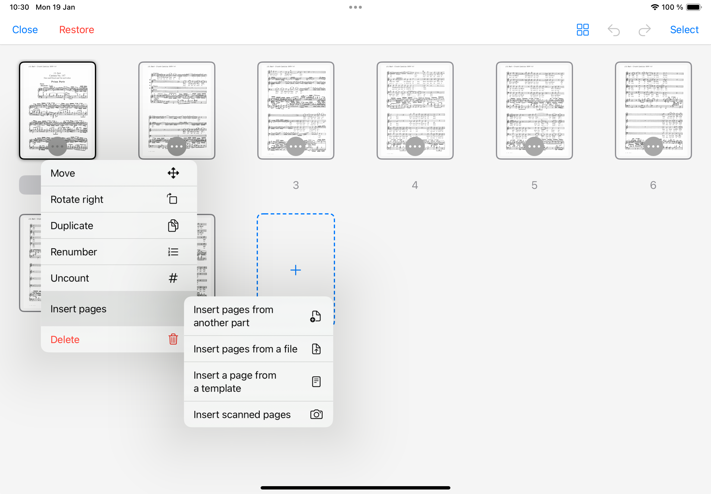 Utilisez la fonction Réorganiser pour organiser les pages de votre partition, pour dupliquer ou supprimer une page, modifier son orientation(portrait ou paysage) et pour ajouter ou insérer des pages.