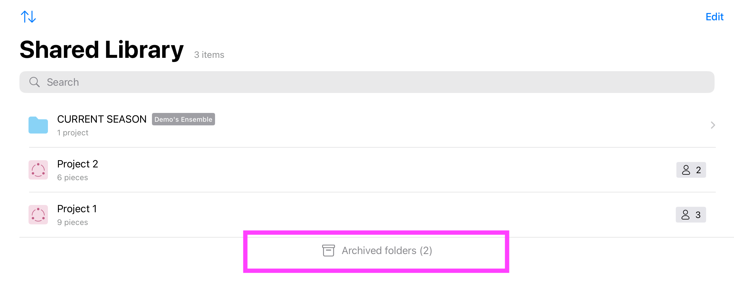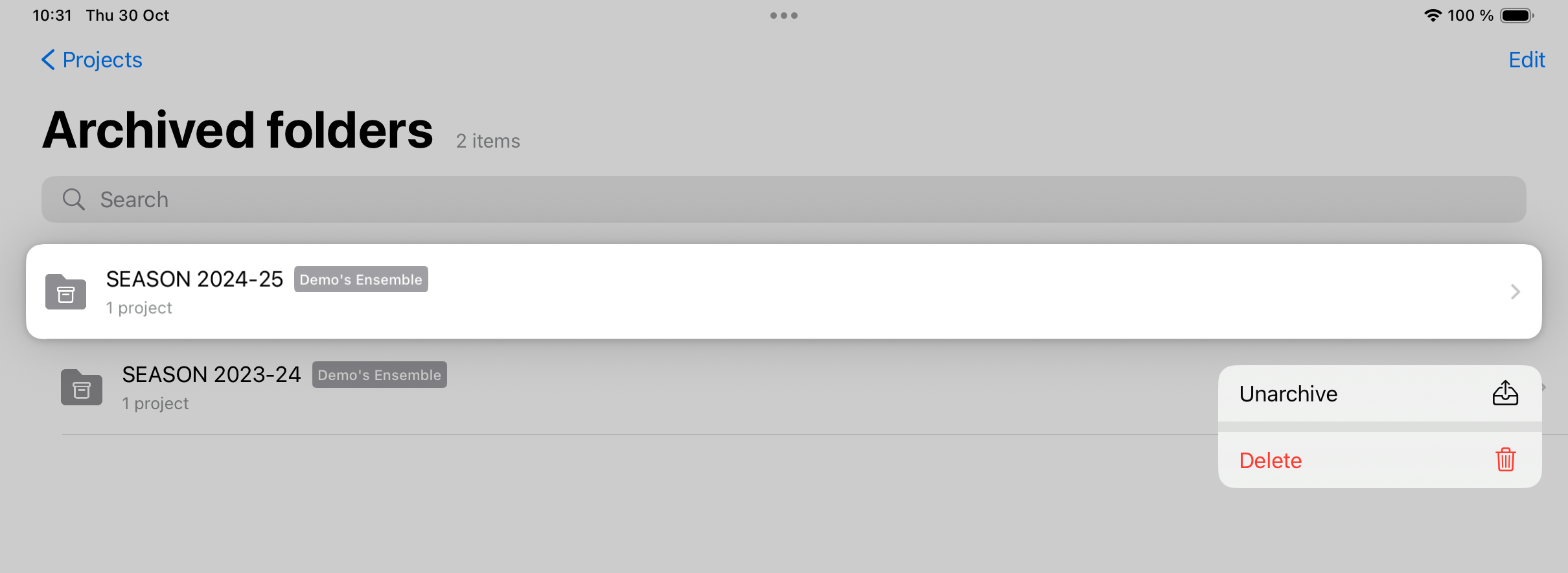 Les dossiers d'archives sont ensuite stockés dans une section distincte, accessible en appuyant sur le bas de la liste des Projets :